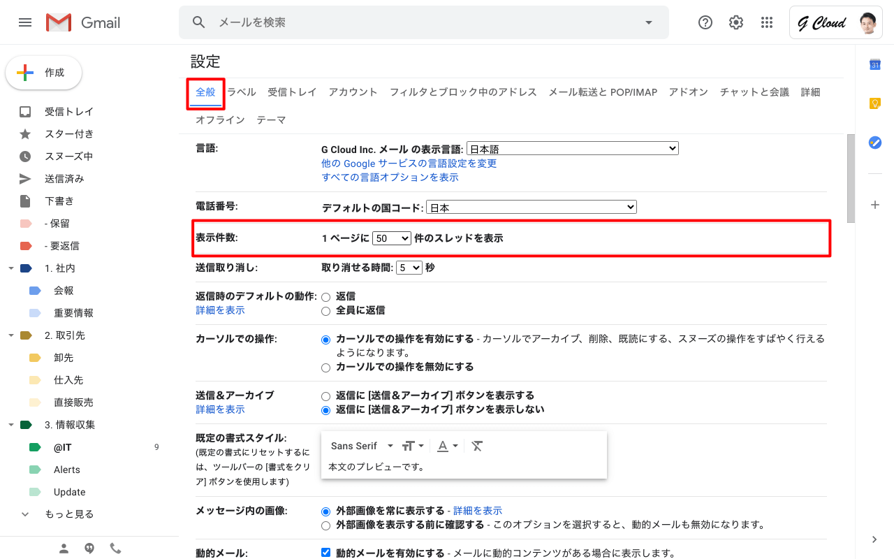 Google Workspace セットアップ&サポート > Google Workspace の使い方 > Gmail > 1ページに表示されるメールリストの件数を変更