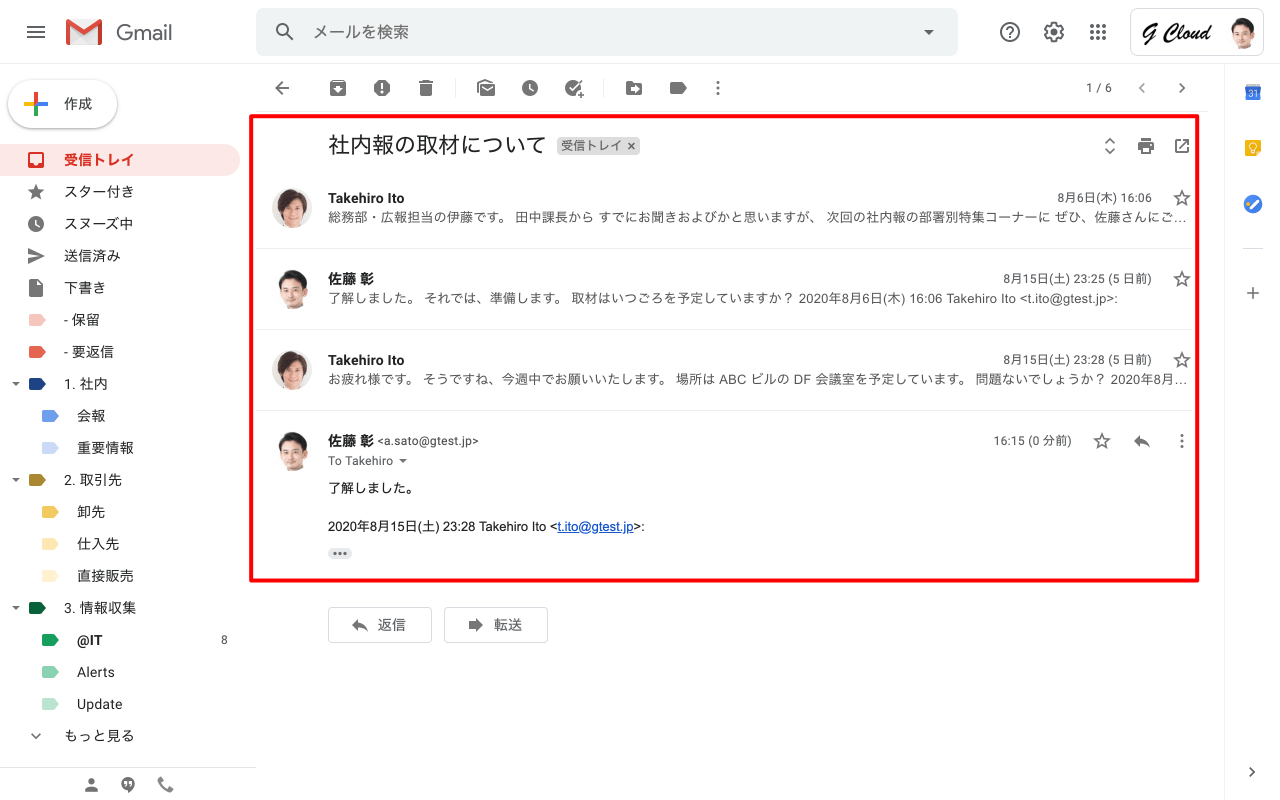 Gmail では、同一の件名のメッセージを 1つのスレッドとしてまとめて表示するスレッドビューが標準の表示形式です。スレッドビューは、新しい返信を受信するたびにスレッドに追加され、スレッドを開くとメッセージがカード状に時系列に重ねて表示されるので、1つの話題についてのメッセージをまとめて読むのには非常に効果的です。